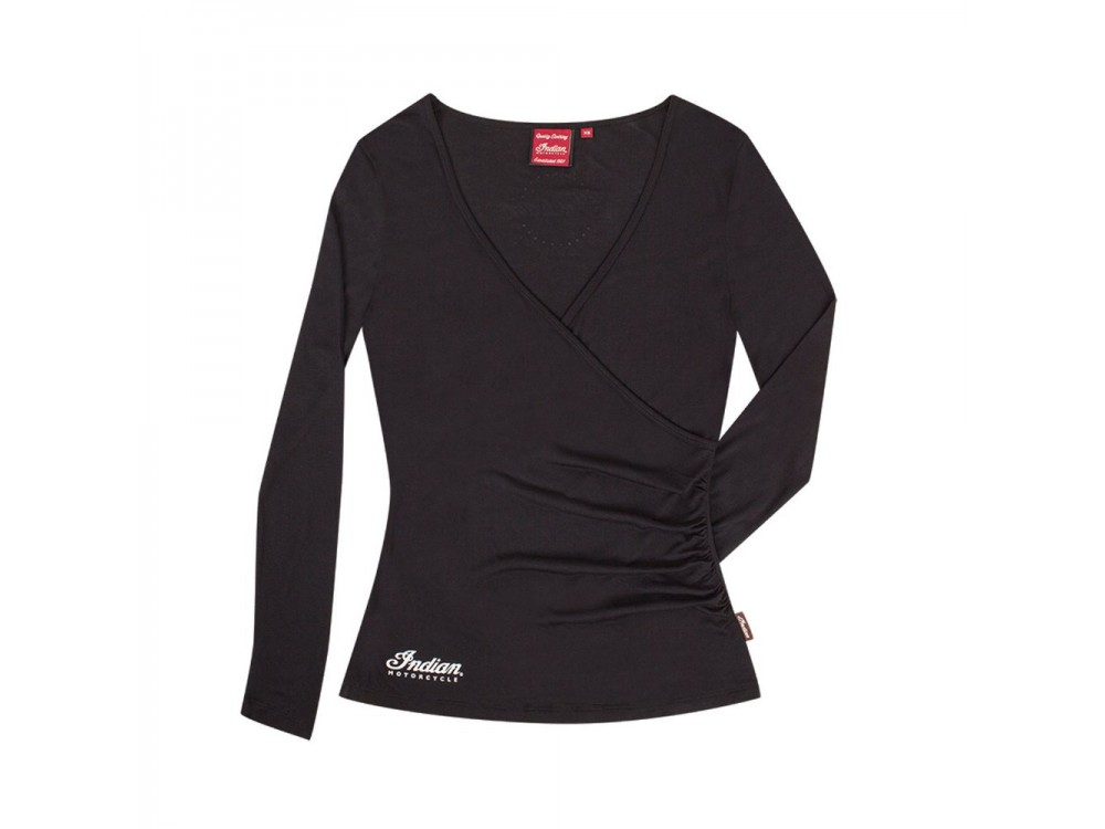 A long sleeve stretch Tee, with crossover detail at the front and gathered side panel for flattering fit.