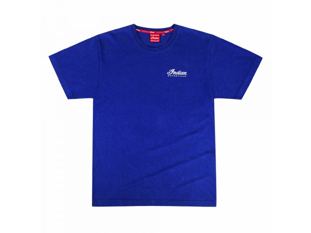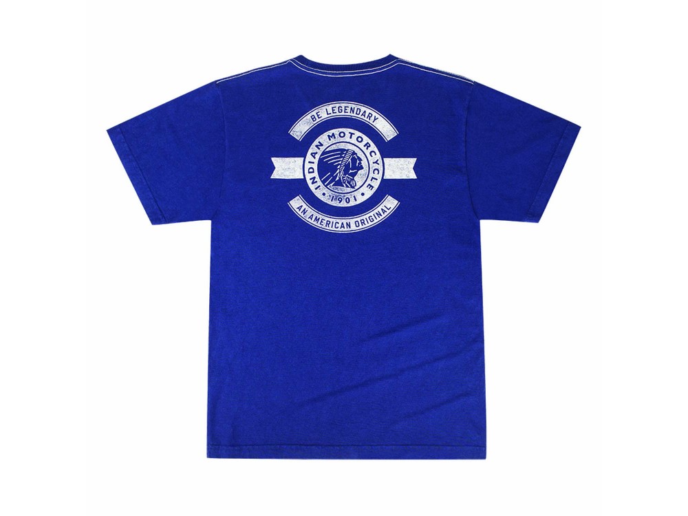 This navy tee shows the Indian Motorcycle® icon logo printed large across the back, in a distressed discharge print. The Indian Motorcycle® logo is printed small on the chest.