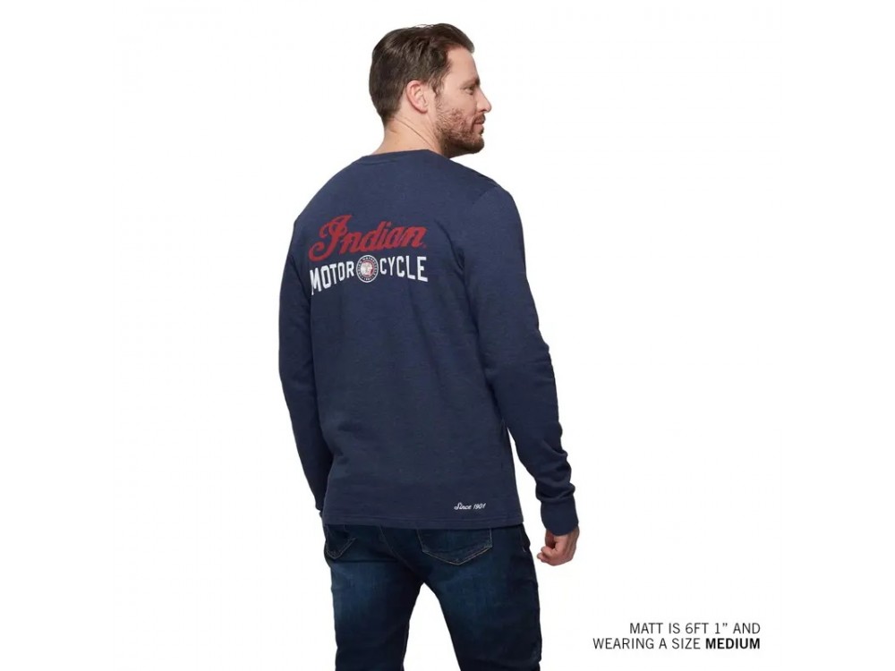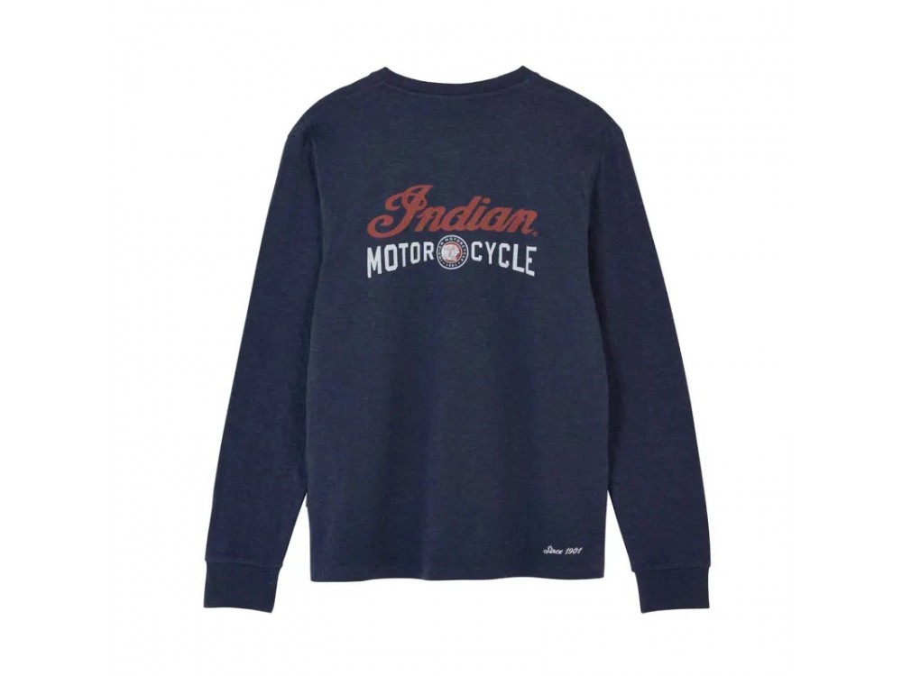 - Large printed script Indian Motorcycle logo on the back and small headdress logo on the front