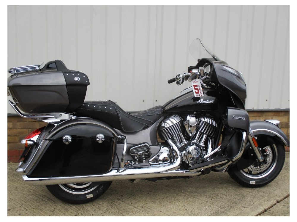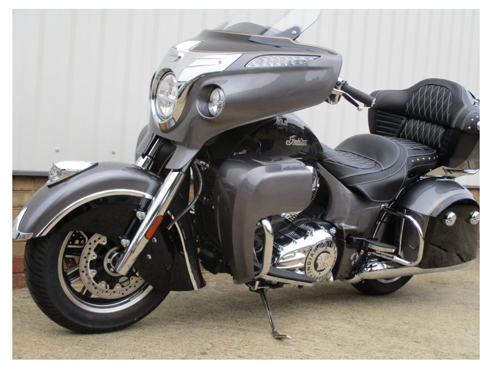 Indian Roadmaster 2017 previously supplied by our store from new and has only had one owner from new. The machine has only covered 3616 miles from new and comes with all original paperwork and keys. Finished in the two tone Grey Metallic and black the bike is a real head turner, ready to soak up the mile with the effortless 1811cc engine.There is a host of features fitted to the top of the range tourer : cruise control, heated grips Tpms, heated seats front a rear, radio, keyless ignition, remote locking, driving lamps. This one owner machine is also fitted with some Indain extra's : stage one exhaust and Ram ball mount.The top box will fit two full face helmets comfortably or if you wish to use the bike as a bagger the topbox will clip off with not too much trouble.