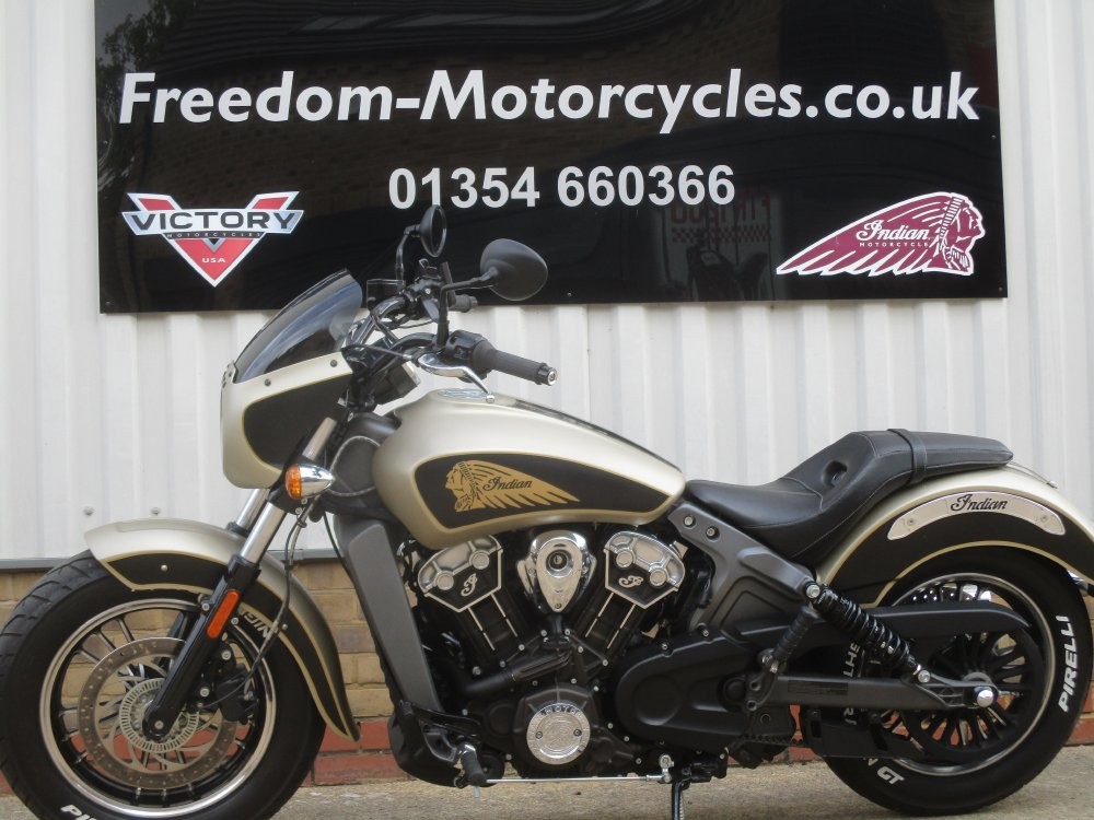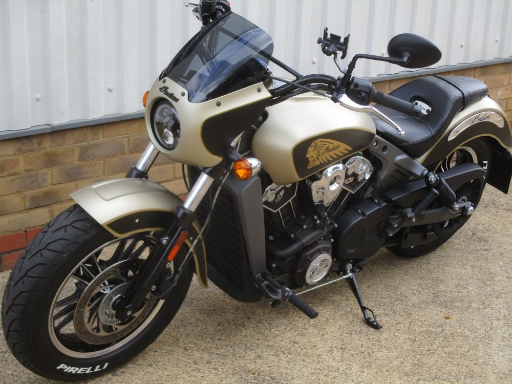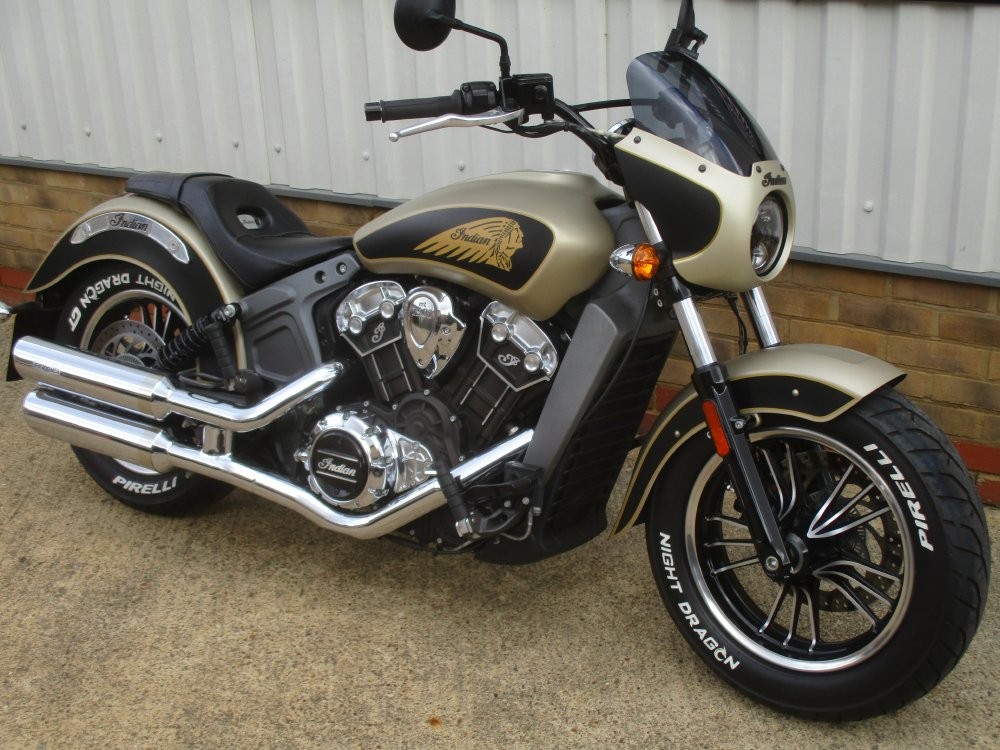 This Indian Scout Dirt Track Smoke has just come back into stock and has only covered 5840 miles from new. The machine was originally sold by us and has been serviced in our workshops. Dirt Track Smoke is a stunning colour ( Matt Gold and Matt Black ) with a small gold coach line this really is a stunner. To add to it's stunning the last customer has made the addition of the following extra's : Indian colour coded top fairing, Remus exhausts, Beach handle bars, phone mount, alloy side plates and Black sport seat and tank decal. Powered by the proven 1133cc v-twin engine this Scout is a real head turner, a true credit to the last owner.