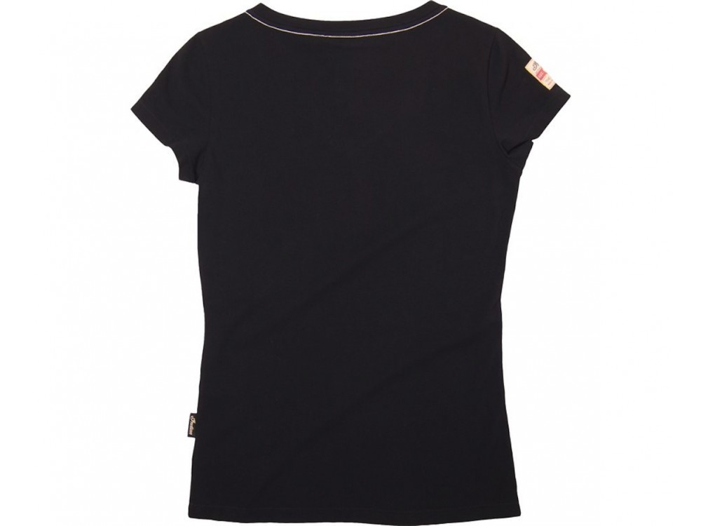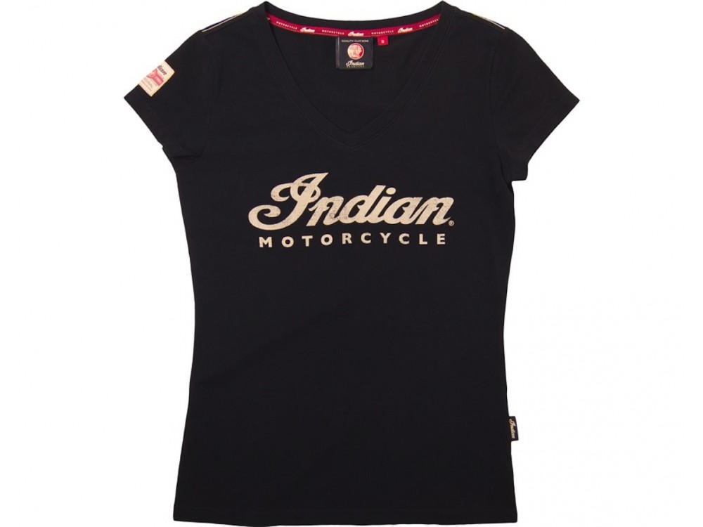A vintage look with a modern fit. This ladies’ cut V-neck T-shirt features a sand-colored distressed Indian logo across the front.